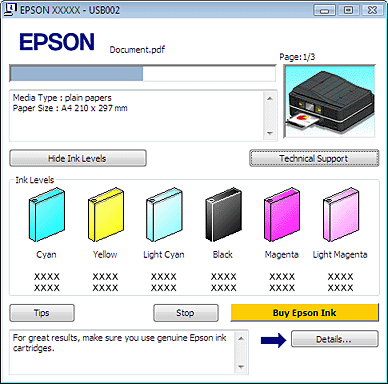 Pokazivač tijeka se automatski pojavljuje kada započnete zadatak ispisa. Možete provjeriti stanje spremnika tinte na ovom zaslonu. Kliknite na gumb Check Ink Levels na zaslonu pokazivača tijeka kako biste prikazali stanje spremnika tinte kao što je pokazano dolje.