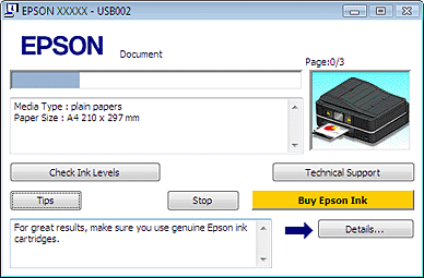 Praktični savjetiRazličiti praktični savjeti za najoptimalnije iskorištavanje upravljačkog programa vašeg Epson pisača se pojavljuju u tekstnom okviru prozora pokazivača tijeka. Za više pojedinosti o praktičnom savjetu prikazanom u prozoru kliknite na gumb Details.