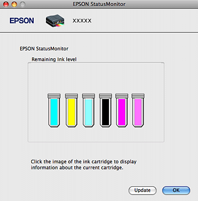 ![]() Također možete koristiti ovaj uslužni program kako biste provjerili stanje spremnika tinte prije ispisivanja. EPSON StatusMonitor prikazuje stanje spremnika tinte u vrijeme kada je otvoren. Za ažuriranje stanja spremnika tinte kliknite na Update.