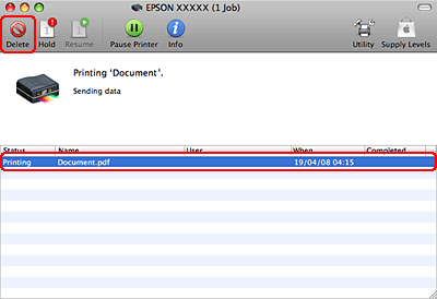 Kliknite na gumb Delete kako biste otkazali zadatak ispisa.