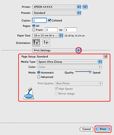 Odaberite odgovarajuće postavke odrednica Media Type, Color i Mode. Pogledajte mrežnu pomoć za pojedinosti o odrednici Print Settings.