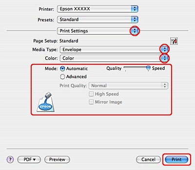Odaberite Envelope kao postavku odrednice Media Type, zatim odaberite odgovarajuće postavke odrednica Color i Mode. Pogledajte mrežnu pomoć za pojedinosti o odrednici Print Settings.
