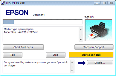 Praktični savjetiRazličiti praktični savjeti za najoptimalnije iskorištavanje upravljačkog programa vašeg Epson pisača se pojavljuju u tekstnom okviru prozora pokazivača tijeka. Za više pojedinosti o praktičnom savjetu prikazanom u prozoru, kliknite na gumb Details.