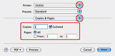 A Printer (Nyomtató) beállításnál jelölje ki a kívánt nyomtatót, majd adja meg a Copies & Pages (Példányszám és oldalak) beállításokat.