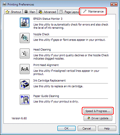 A Speed & Progress (Sebesség és előrehaladás) párbeszédpanel egyes beállításaival növelhető a nyomtatási sebesség. Kattintson a nyomtató-illesztőprogram Maintenance (Karbantartás) ablakában a Speed & Progress (Sebesség és előrehaladás) gombra.