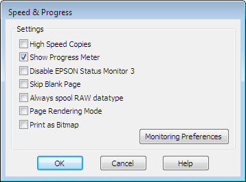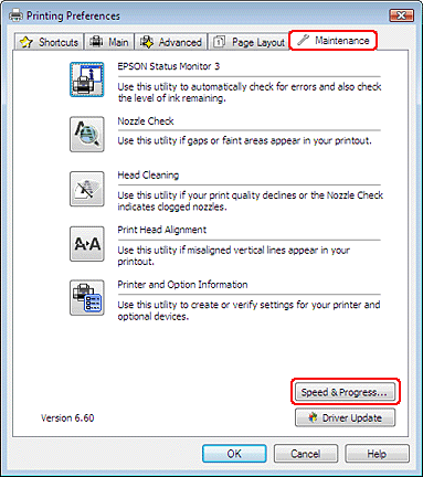 A Speed & Progress (Sebesség és előrehaladás) párbeszédpanel egyes beállításaival növelhető a nyomtatási sebesség. Kattintson a nyomtató-illesztőprogram Maintenance (Karbantartás) ablakában a Speed & Progress (Sebesség és előrehaladás) gombra.