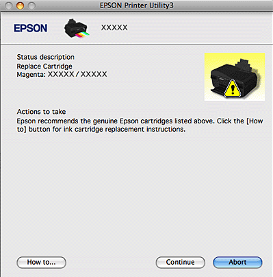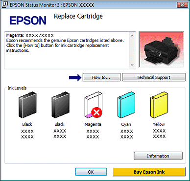 ![]() Ha kevés vagy kifogy a tinta, megjelenik egy How to (Hogyan) gomb. Ha rákattint az How to (Hogyan) gombra, az EPSON StatusMonitor lépésenként végigvezeti a patroncsere folyamatán.