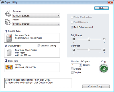 Ha törli a jelölést az Easy Print Setting négyzetből a Copy Utility ablakban, akkor megjelenik a nyomtatóbeállítás ablak. A beállítások megadását a nyomtató dokumentációja ismerteti részletesen.