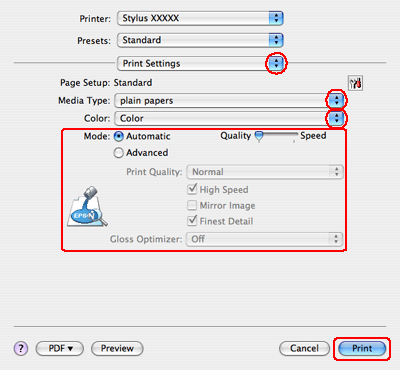 Adja meg a megfelelő Media Type (Hordozótípus), Color (Színes) és Mode beállításokat. A Print Settings (Nyomtatási beállítások) párbeszédpanelen lévő beállításról további részleteket az online súgóban talál.