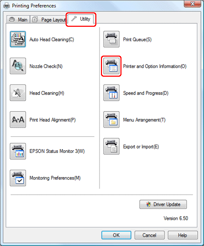 Kattintson a Utility (Segédprogram) fülre, majd a Printer and Option Information (A nyomtató és a beállítások adatai) gombra.
