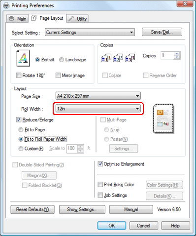 Válassza ki a Reduce/Enlarge (Kicsinyítés/Nagyítás) opciót, majd kattintson a Fit to Roll Paper Width (Igazítás a papírtekercs szélességéhez) opcióra.
