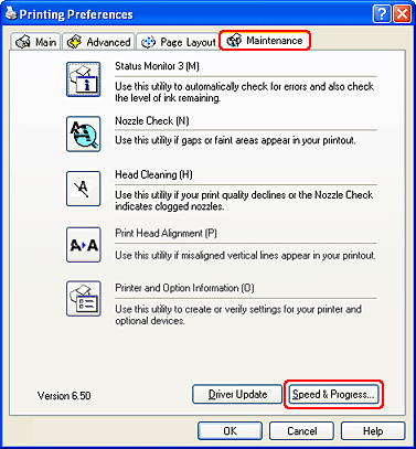 A Speed & Progress (Sebesség és előrehaladás) ablak egyes beállításaival növelhető a nyomtatási sebesség. Kattintson a nyomtató-illesztőprogram Maintenance (Karbantartás) ablakában a Speed & Progress (Sebesség és előrehaladás) gombra.
