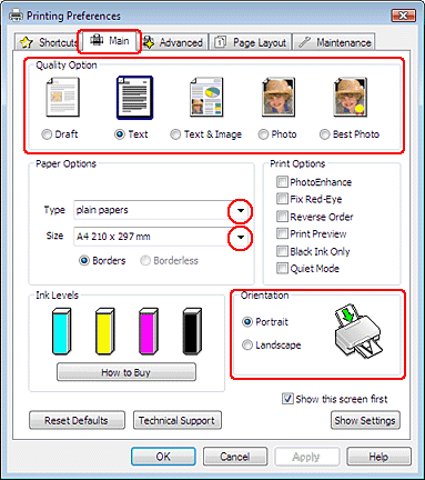 Kattintson a Main (Fő) fülre, majd válassza ki az egyik Quality Option (Minőség típusa) értéket: