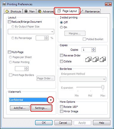 Kattintson a Page Layout (Elrendezés) fülre, válassza ki a kívánt vízjelet a Watermark (Vízjel) listából, majd kattintson a Settings (Beállítások) gombra.