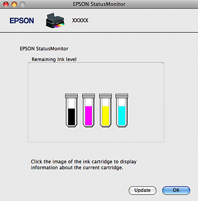 ![]() A segédprogram használatával a tintapatronok állapotát is ellenőrizheti nyomtatás előtt. Az EPSON Status Monitor 3 segédprogram megjeleníti a tintapatron állapotát a megnyitás időpontjában. A tintapatronban lévő tinta mennyiségének frissítéséhez kattintson az Update gombra.