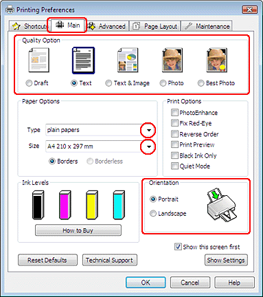 Kattintson a Main (Fő) fülre, majd válassza ki az egyik Quality Option (Minőség típusa) értéket: