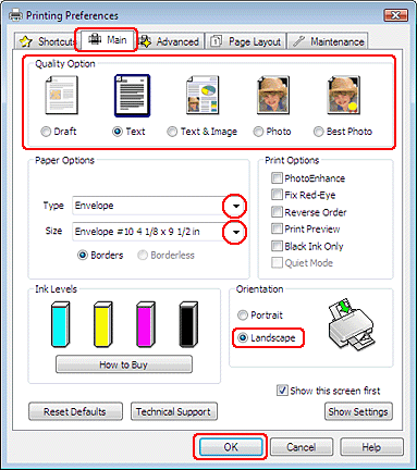 Selezionare Envelope (Busta) come impostazione di Media Type (Supporto), quindi definire le impostazioni appropriate di Color (Colore) e Mode (Modo). Per informazioni dettagliate su Print Settings (Impostazioni di stampa), vedere la guida in linea.