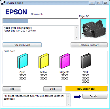 La barra di avanzamento viene automaticamente visualizzata quando si avvia un lavoro di stampa. Da questa finestra è possibile controllare lo stato della cartuccia d'inchiostro. Fare clic sul pulsante Check Ink Levels (Verifica livelli inchiostro) nella schermata della barra di avanzamento per visualizzare lo stato della cartuccia di inchiostro, come mostrato sotto.