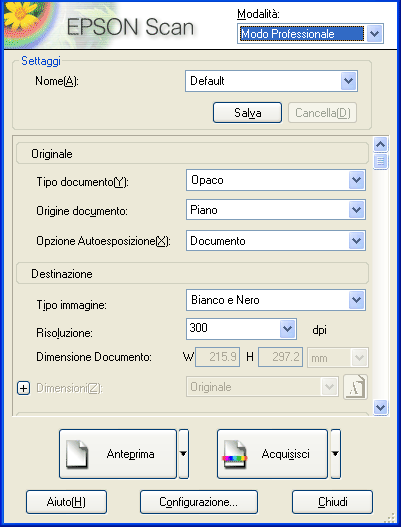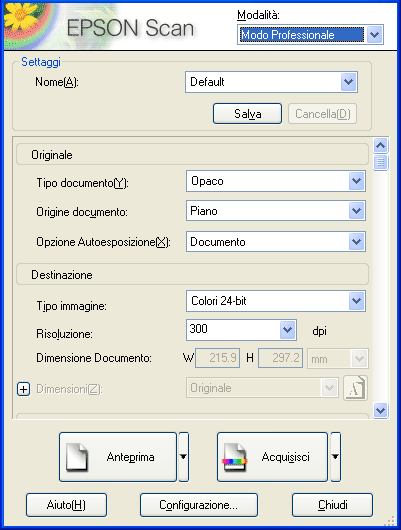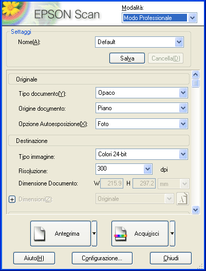 ![]() | Avviare EPSON Scan e quindi selezionare il modo Professionale. Per informazioni dettagliate sulla selezione di un modo di scansione, vedere Modifica del modo di scansione. |