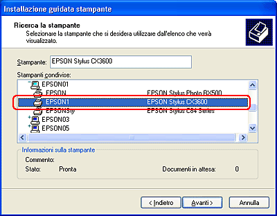 A seconda del sistema operativo e della configurazione del computer al quale questo prodotto è collegato, l'Installazione guidata stampante potrà richiedere di installare il driver della stampante dal CD del software della stampante. In questo caso, fare clic sul pulsante Disco driver e seguire le istruzioni visualizzate sullo schermo.