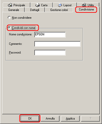 Selezionare la casella di controllo Condividi Stampante, quindi digitare il nome e la password della stampante in base alle proprie esigenze.