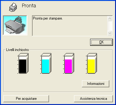 Se una qualsiasi cartuccia installata in questo prodotto risulta essere rotta, incompatibile con il modello di stampante in uso o installata in modo non corretto, EPSON StatusMonitor non visualizzerà un calcolo preciso della quantità di inchiostro rimanente in ciascuna delle cartucce. Assicurarsi di sostituire o installare nuovamente le cartucce d'inchiostro indicate da EPSON StatusMonitor.