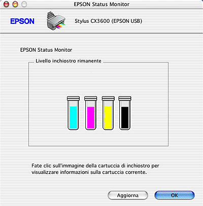 L'immagine grafica visualizza la quantità di inchiostro rimanente al momento dell'apertura di EPSON StatusMonitor. Per aggiornare le informazioni sul livello di inchiostro, fare clic su Aggiorna.