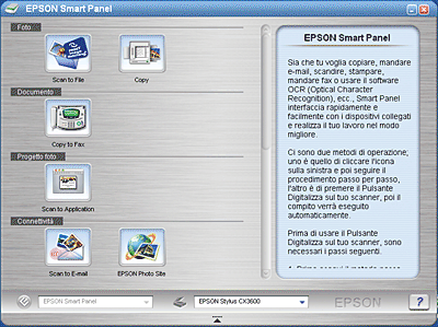 EPSON Smart Panel consente di acquisire e inviare i dati direttamente a un'applicazione designata o al sito Web EPSON per la condivisione delle foto. È possibile inoltre digitalizzare foto e documenti in modo facile e veloce.