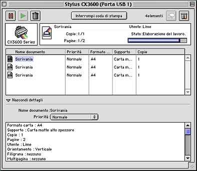 EPSON Spool Manager è simile al Print Manager di Windows. Se Spool Manager riceve contemporaneamente due o più lavori di stampa, li mantiene nell'ordine in cui sono stati ricevuti (nel caso di stampanti in rete, questa funzione viene denominata coda di stampa). Quando un lavoro di stampa raggiunge l'inizio della coda, EPSON Spool Manager lo invia alla stampante. Da Spool Manager è possibile annullare i lavori di stampa. È inoltre possibile visualizzare le informazioni di stato relative ai lavori di stampa inviati a questo prodotto, come anche mettere in pausa e riprendere nuovamente i lavori di stampa selezionati.