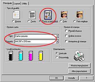 Fare clic sulla scheda Principale, quindi selezionare Carta comune e A4 come impostazione di Opzioni carta e Testo e immagine come impostazione di Tipo di qualità.