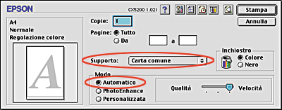 Selezionare Carta comune come impostazione di Supporto e Automatico come impostazione di Modo.