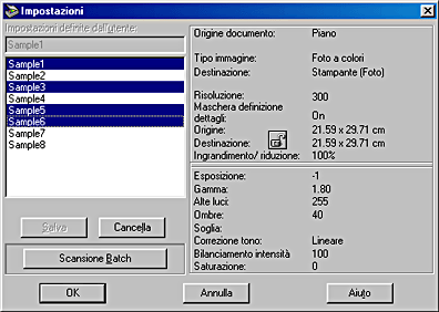 Per effettuare la scansione di una singola immagine con molte impostazioni differenti, creare e salvare diversi gruppi di impostazioni come descritto in precedenza. Quindi, tenere premuto il tasto Maiusc e fare clic sui gruppi di impostazioni personalizzate da selezionare nell'elenco Impostazioni definite dall'utente. Dopo aver selezionato i gruppi di impostazioni da utilizzare durante la scansione, fare clic su Scansione Batch. Questo prodotto effettuerà la scansione dell'immagine una volta per ciascun gruppo di impostazioni selezionato.