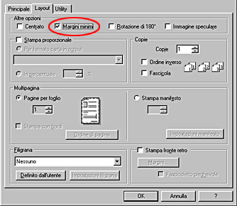 Se si estende l'area stampabile selezionando Margini minimi come impostazione di Altre opzioni (Windows) oppure selezionando Massimo come impostazione di Area stampabile (Macintosh) nel software della stampante, l'angolo tagliato sulla carta speciale potrebbe rovinare il risultato stampato.