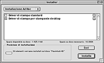Scegliere Installazione Ad Hoc nella finestra di dialogo Installer e selezionare la casella di controllo Driver di stampa per stampante desktop.
