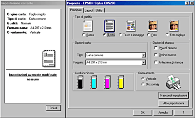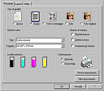 Nel menu Principale è possibile eseguire le impostazioni di Tipo di qualità, Opzioni carta, Opzioni di stampa, Orientamento, Altre impostazioni e controllare i livelli di inchiostro. Fare riferimento alla sezione appropriata riportata di seguito.
