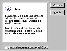 ![]() | Nel menu Principale, fare clic sul pulsante Altre impostazioni. Se appare la finestra delle note sotto riportata, fare clic su Continua. Verrà visualizzato il menu con le impostazioni avanzate. |