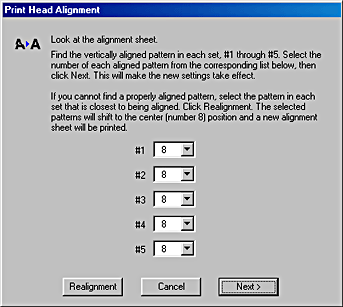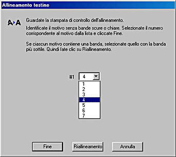 Individuare il motivo che non contenga alcuna striscia nera o bianca. Quindi, individuare il numero di motivo corrispondente dalla casella di riepilogo a discesa nella finestra di dialogo Allineamento testine. Fare clic su Avanti. Le nuove impostazioni verranno attivate.