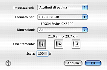 Nella finestra di dialogo Formato di Stampa, è possibile modificare il formato della carta, specificare l'orientamento della carta e ridurre o ingrandire la stampa.