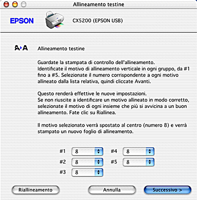 Individuare il motivo che non contenga alcuna striscia nera o bianca. Quindi, individuare il numero di motivo corrispondente dalla casella di riepilogo a discesa nella finestra di dialogo Allineamento testine. Fare clic su Avanti. Le nuove impostazioni verranno attivate.