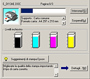 EPSON Spool Manager è simile al Print Manager di Windows. Se lo Spool Manager riceve contemporaneamente due o più lavori di stampa, li mantiene nell'ordine in cui sono stati ricevuti (nel caso di stampanti in rete, questa funzione viene denominata coda di stampa). Quando un lavoro di stampa raggiunge l'inizio della coda, EPSON Spool Manager lo invia alla stampante. Da Spool Manager è possibile annullare i lavori di stampa. È inoltre possibile visualizzare le informazioni di stato relative ai lavori di stampa inviati a questo prodotto, come anche mettere in pausa e riprendere nuovamente i lavori di stampa selezionati.