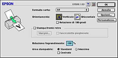 In Macintosh, selezionare l'impostazione desiderata di Formato carta e Verticale (alto) o Orizzontale (largo) per modificare l'orientamento della stampa nella finestra di dialogo Formato di Stampa. Quindi, nella finestra di dialogo Stampa, selezionare il Supporto desiderato.