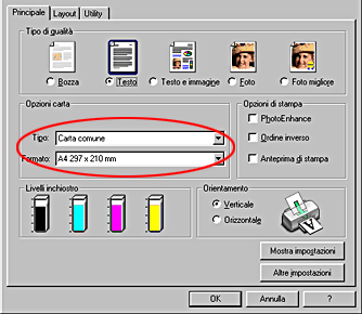 ![]() | Nel menu Principale (Windows), selezionare il Formato ed il Tipo desiderato in Opzioni carta. Quindi, selezionare Verticale (alto) o Orizzontale (largo) per modificare l'orientamento delle stampe. |