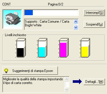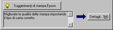 Nella casella di testo della parte inferiore della finestra della barra di avanzamento vengono visualizzati suggerimenti per sfruttare al meglio il software della stampante EPSON. Ogni 30 secondi viene visualizzato un nuovo suggerimento. Per informazioni dettagliate sul suggerimento visualizzato nella finestra, fare clic sul pulsante Dettagli.