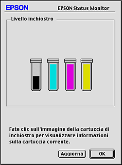 È possibile utilizzare questa utility per controllare i livelli di inchiostro prima della stampa. Quando è aperta, EPSON StatusMonitor visualizza la quantità di inchiostro rimanente al momento dell'apertura. Per aggiornare le informazioni sul livello di inchiostro, fare clic su Aggiorna.