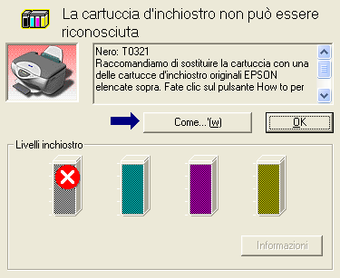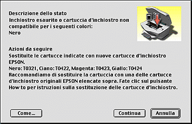 Quando l'inchiostro è scarso o esaurito, sotto la casella di testo apparirà il pulsante Come.... Fare clic su Come... ed EPSON Status Monitor 3 guiderà l'utente nella procedura di sostituzione della cartuccia.