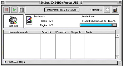 Dopo aver inviato un lavoro di stampa, sulla barra delle applicazioni verrà visualizzato il pulsante EPSON Stylus CX5400. Fare clic su questo pulsante per aprire EPSON Spool Manager.