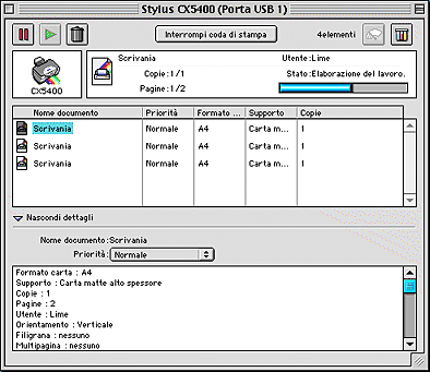 Dopo aver inviato un lavoro di stampa alla stampante, è possibile utilizzare l'utility EPSON MonitorIV per controllare, annullare o modificare la priorità dei lavori di stampa che sono in coda e in attesa di essere stampati. Questa utility mostra inoltre lo stato del lavoro in corso di stampa.