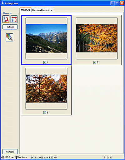 Nella finestra dell'anteprima Miniatura: EPSON Scan individua automaticamente i fotogrammi della pellicola o le foto multiple e quindi visualizza in anteprima le immagini sotto forma di miniature. Selezionare la casella di controllo del numero corrispondente all'immagine da acquisire.