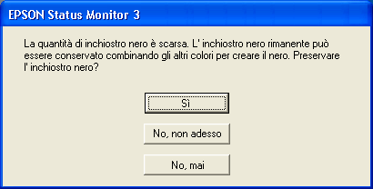 Facendo clic sul pulsante No, mai, è possibile continuare a utilizzare normalmente l'inchiostro nero. La finestra di dialogo non viene più visualizzata per la durata rimanente della cartuccia d'inchiostro nero. In questo caso, l'inchiostro nero viene utilizzato normalmente fino al completo esaurimento della cartuccia.