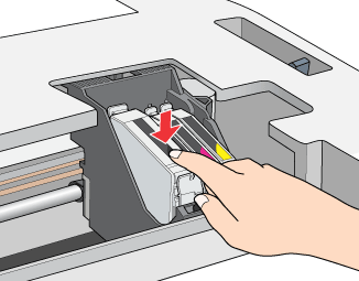 Posizionare la cartuccia d'inchiostro verticalmente nell'apposito supporto. Spingere verso il basso la cartuccia fino a farla scattare in posizione.